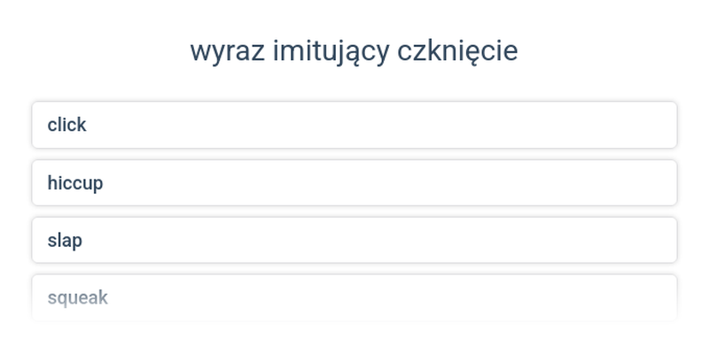 Klasyczne ćwiczenie do nauki angielskiego słownictwa: wybierz poprawne tłumaczenie słowa spośród dostępnych opcji. Oferujemy ponad 3000 słówek przejrzyście pogrupowanych według tematyki i poziomu trudności. Zalecamy włączenie dźwięku – większość słówek dysponuje nagraniem z poprawną wymową. Jeśli chcesz poćwiczyć także pisanie słówek, wypróbuj ćwiczenie Pisanie słówek.